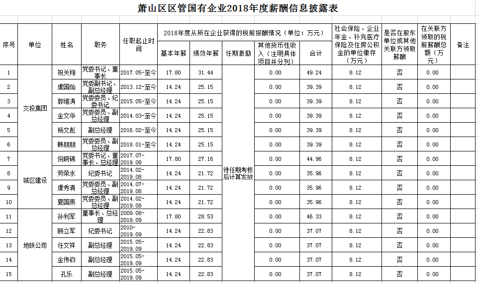 【公示】蕭山區區管國有企業2018年度薪酬信息披露表
