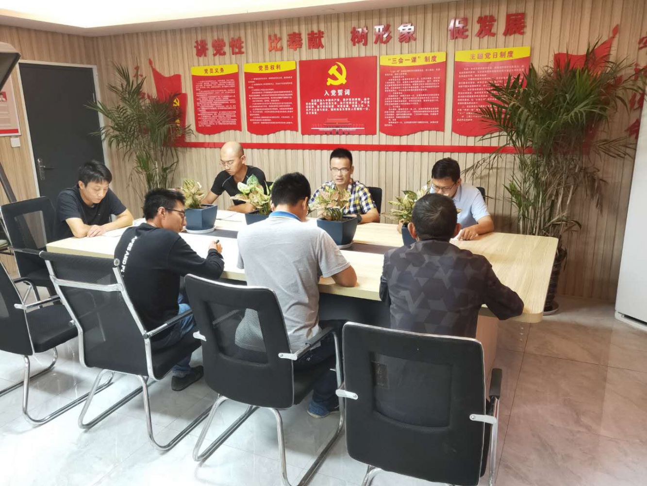 9月17日下午,天空飄著細雨。新塘街道姑娘橋村安置房項目部黨員活動室內氣氛寧靜,地鐵投資公司黨建聯盟中的8名黨員同志趁著雨天及項目部剛結束生產監理例會、安全生產培訓會議的機會,正在認真學習上級黨委文件、政治理論和反腐倡廉要求。