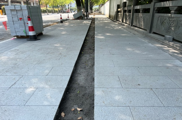 當前進度:蕭然南路、拱秀路、潘水路三條道路正在側平石及人行道板鋪設中,西河路處于行道樹補種更換階段。