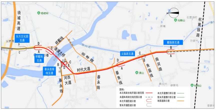 2022年9月5日上午10時,時代大道南延(繞城至中環段)工程橋戴線-戴臨路段高架橋開通試運行,同步開通橋戴線互通B、C匝道、春永連接線互通(上、下行)匝道、義臨路互通A、D匝道、戴臨路互通A、B匝道,本次開通高架主線里程共5.75公里。