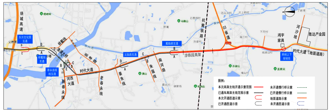 本次擬開通路段為時代大道南延(繞城至中環段)工程主線高架、東方文化園互通C、D匝道(約3.4公里),03省道改擴建下穿杭黃鐵路高架段(約1.06公里),共計全長約4.46公里。其中,東方文化園互通義橋方向上下匝道開通,高架主線保證雙向4車道通行,匝道保證單向一車道通行。