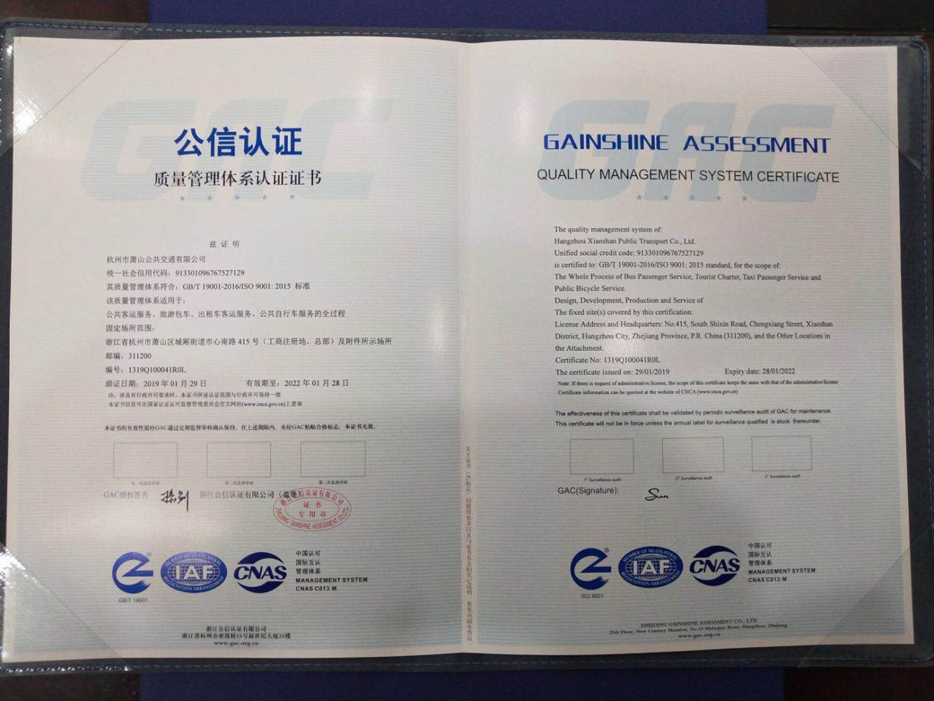2019年1月29日,浙江公信認(rèn)證有限公司向蕭山公交公司頒發(fā)《質(zhì)量管理體系認(rèn)證證書 》,這標(biāo)志著我司的公共客運服務(wù)、旅游包車、出租客運服務(wù)、公共自行車服務(wù)的全過程質(zhì)量管理體系符合GB/T19001-2016/ISO 9001:2015標(biāo)準(zhǔn)。此證書同時證實了我司不僅有能力提供滿足廣大乘客需求的優(yōu)質(zhì)服務(wù),而且服務(wù)質(zhì)量已經(jīng)達(dá)到了國際認(rèn)可的標(biāo)準(zhǔn),這對于企業(yè)實施品牌戰(zhàn)略、實現(xiàn)企業(yè)長遠(yuǎn)、可持續(xù)發(fā)展具有十分重要的現(xiàn)實意義。