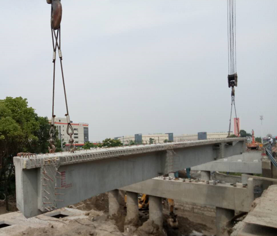 原雷山橋位于紅十五線與雷山河交界之上,新建成總長為40.5M(其中跨徑20M*2)、可供雙向六車道通行。在施工過程中為保證邊通車邊施工的安全,確保此次安裝能順利完成,3標項目部領導和技術員在梁板安裝前對現場作業人員進行了詳細的施工技術及安全交底,現場施工過程中,技術人員認真核對設計圖紙,嚴格做好抓安全、保質量工作,對每道工序施工質量和報驗程序進行嚴格把關,保證各道工序層層落實到位。監理組全過程進行旁站對施工各環節進行監控。本次梁板安裝,施工單位配備相關工作人員24名,其中有起重工6名,運輸車司機4名、吊車司機2名、指揮1名、以及其他相關工作員11名。主要使用一輛100T吊機和一輛80T龍門吊用于現場吊裝作業,4輛T梁運輸車用于梁板運輸,電焊機2臺用于焊接鋼筋。